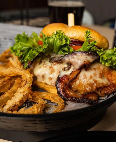 1/2 lb beef patty with cheddar cheese, our famous onion rings, bacon, and BBQ sauce on a toasted bun